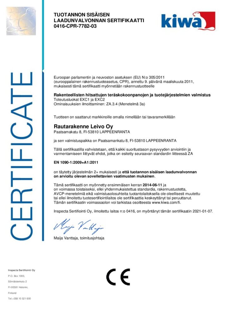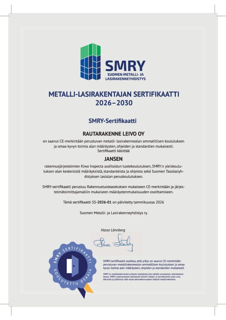 Rautarakenne Leivo on EN ISO 1090 sertifioitu monipuolinen metallialan yritys, jossa riittää kapasiteettia ja tietotaitoa joustavasti yksittäisistä töistä aina isoihin sarjoihin asti. Erityisosaamistamme ovat vahvat ja kestävät teräsovet ja julkisivut, mutta palvelemme myös asiakaslähtöisesti yksilöllisissä tarpeissa kaikissa teräs- ja alumiinitöissä. Asiakaslähtöisyys on meille tärkeintä: lujan kokemuksen ja monipuolisen osaamisen omaavat ammattilaisemme palvelevat joustavasti hitsauksen, koneistuksen, levyleikkauksen ja särmäyksen kokonaisratkaisuissa aina tuotannosta asennukseen asti.